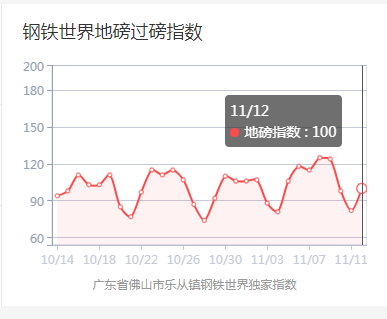 周一夜盘,黑色系期货走势有所回升,今早开盘后,螺纹钢期货回落后再拉升至飘红,最高报3895元/吨,目前来看期螺跌势暂缓。昨日因下游需求恢复,唐山地区普碳方坯出厂价格回涨20元,今早唐山钢坯报价再涨10元,目前报3690元/吨含税出厂。昨日现货市场方面,全国主要城市建筑钢材价格和热轧板卷价格均大幅下跌,且成交一般;钢厂调价方面,超20家钢厂相继下调建材出厂价格,以华东、华北、西南区域为主,如日照钢铁对螺纹、盘螺下调90元/吨,涟钢对螺纹下调60元/吨。11月12日,钢铁世界地磅过磅指数录得100点,园区出货量保持高位。