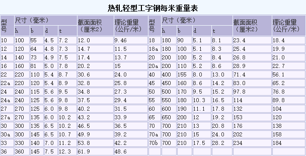 工字钢分普通型和轻型,与同一型号的普通工字钢相比,轻型工字钢的腰厚尺寸较小、重量较轻。腿宽尺寸则随型号大小的不同而异:型号小的(I32#以下),腿宽尺寸较普通工字钢小;型号大的(I40#以上),腿宽尺寸较普通工字钢大。