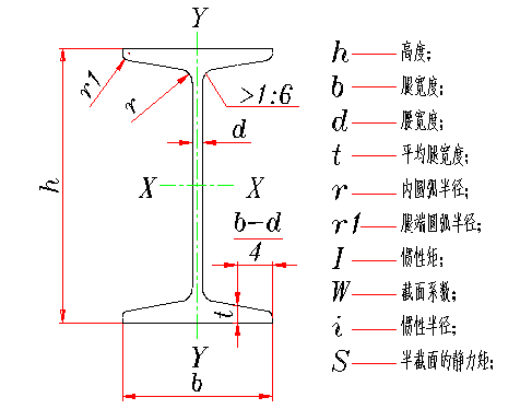 工字钢的规格可用其截面的主要轮廓尺寸(mm)来表示,即以腰高(h)*腿宽(b)*腰厚(d)的毫米数,如1160*88*6。工字钢规格也可用型号(号数)来表示,型号表示腰高的厘米数。腰高相同的工字钢,如有几种不高的腿宽和腰厚,需在型号右边加标码(也称角码)a或b或c予以区别。