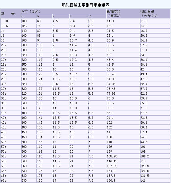 重量:工字钢计算理论重量时,钢的密度为 7.85G/立方厘米 工字钢截面面积的计算公式为: HD+2T(B-D)+0.815(R平方-R1平方)